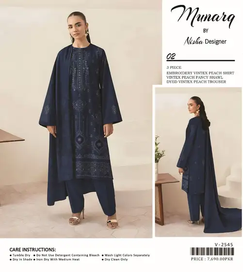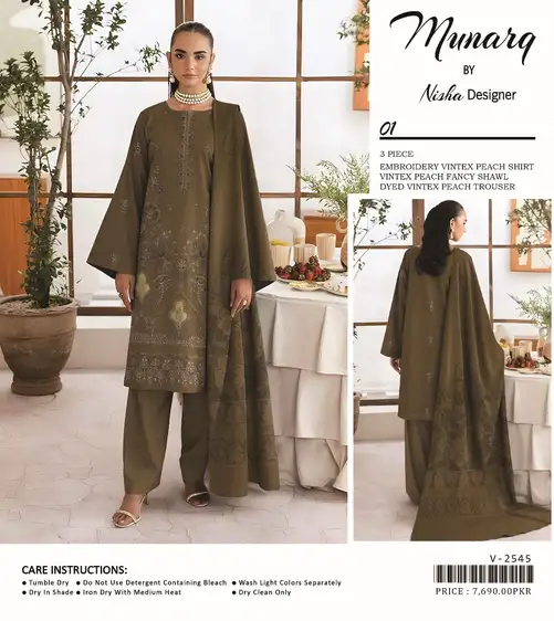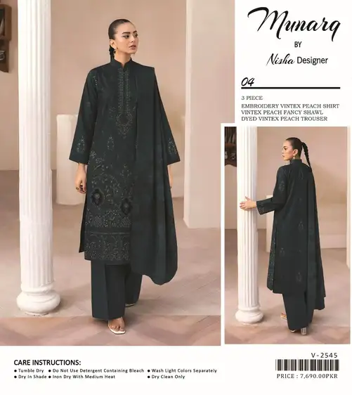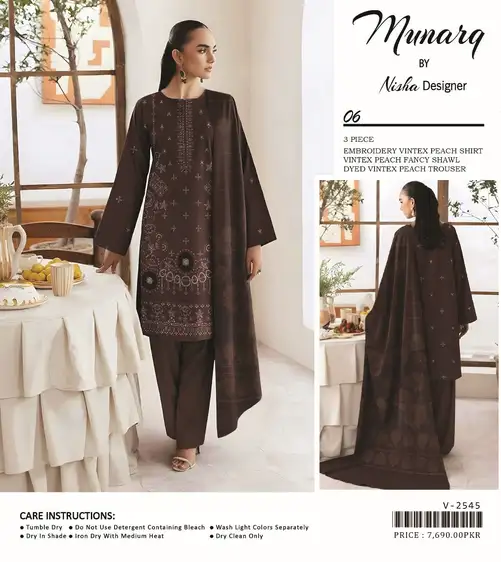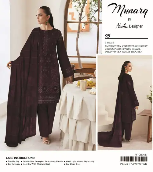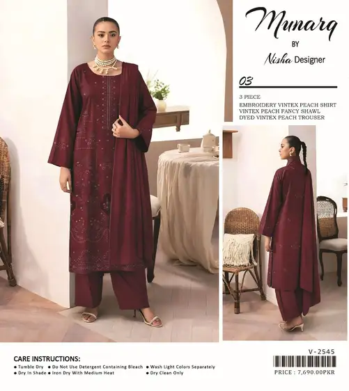 Each suit includes a beautifully embroidered Vintex Peach shirt, a fancy Vintex Peach shawl dupatta, and a dyed Vintex Peach trouser. With 7 stunning designs in 7 different colors, this set is a complete winter fashion statement for semi-formal and festive gatherings.