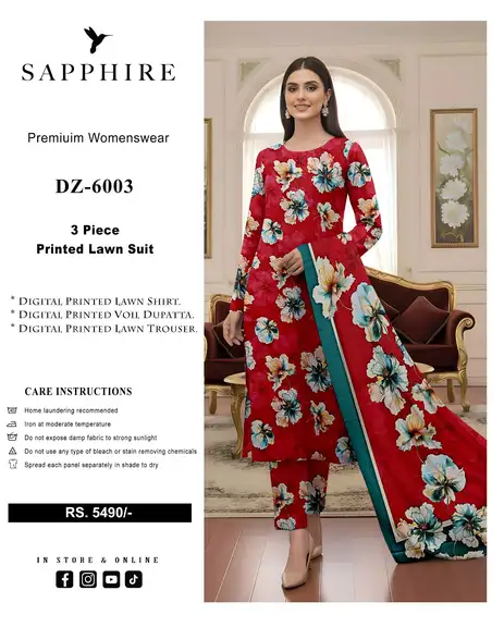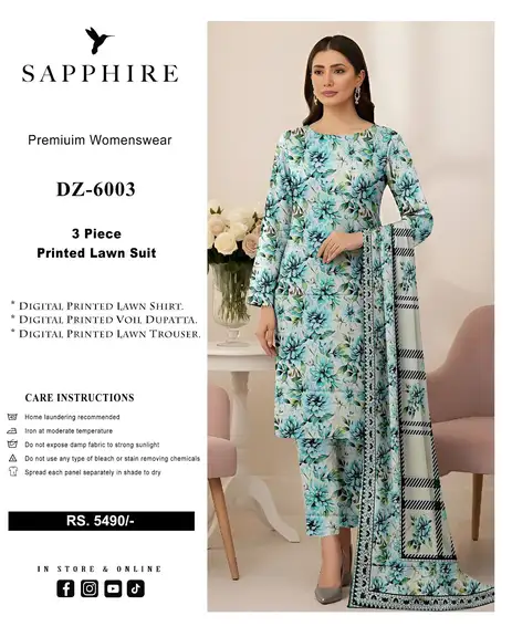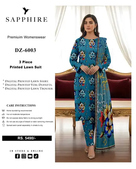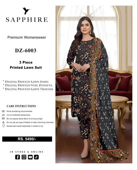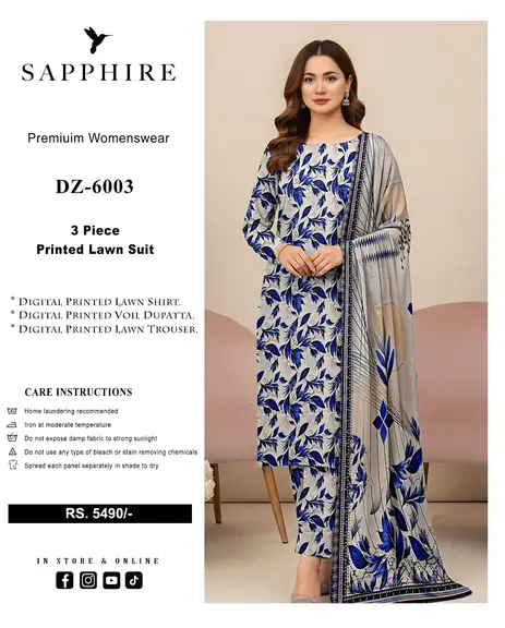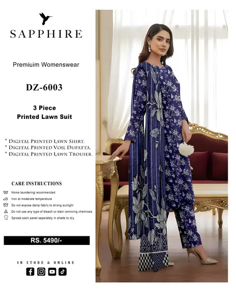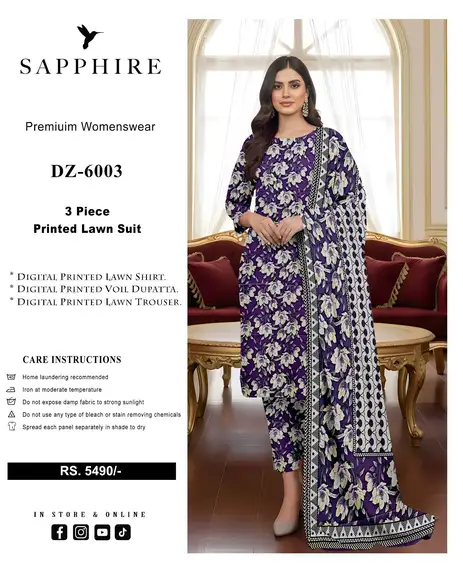 Introducing the elegant Sapphire Digital Printed Lawn Suit (Vol DZ 6003), crafted with premium Airjet Lawn fabric for soft feel, comfort, and stylish summer wear ☀️✨
