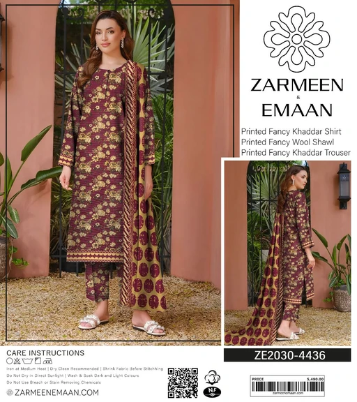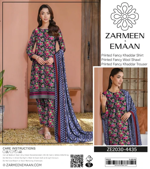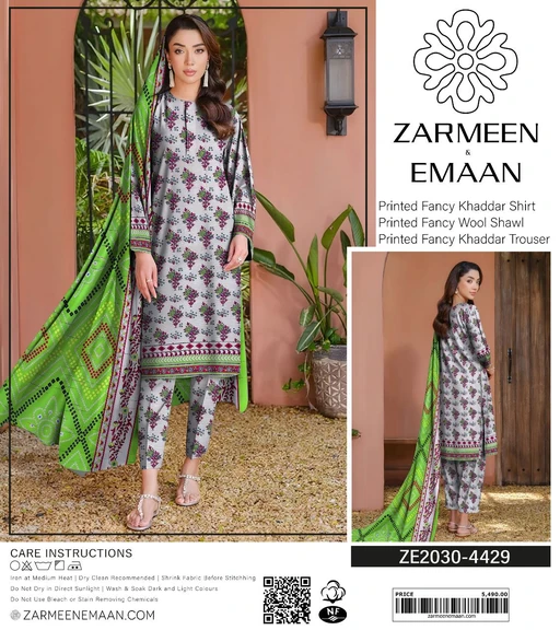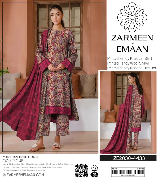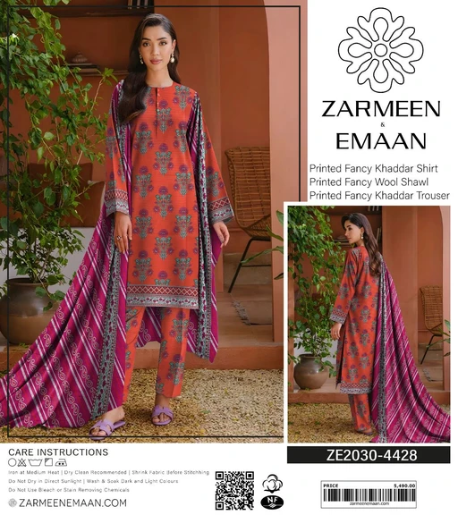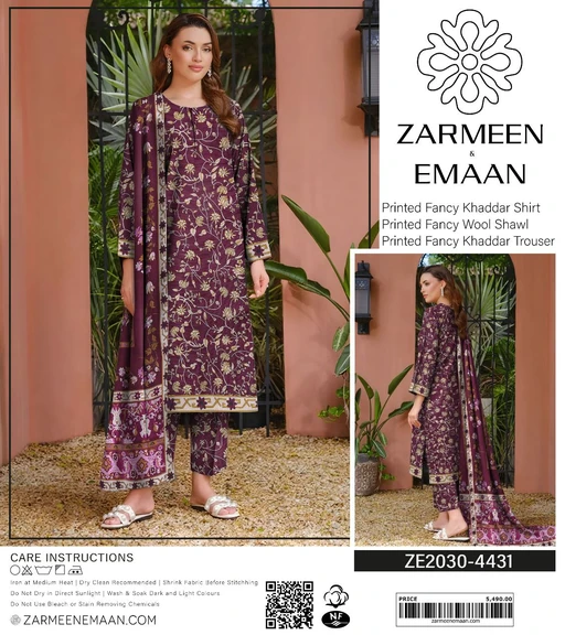 Step into the season with style and comfort with Zarmeen Emaan’s Winter Collection. This Printed Fancy Khaddar & Wool Suit Collection offers a perfect blend of luxury, warmth, and vibrant colors. Designed with the finest fabrics and 100% original quality, it’s an essential winter wardrobe update for fashion-forward women.